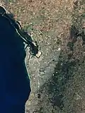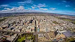Centro financeiro de Adelaide, em 2022 Imagem de satélite da cidade de Adelaide Rymill Park no outono Vista aérea e parcial da cidade Estádio Hindmarsh, com o clube Adelaide United Football Club em campo Praça Vitória (Victoria Square) | |