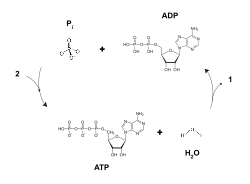 A quebra de uma das ligações de fósforo do ATP gera aproximadamente 30,5 kilojoules por mole de ATP (7,3 kcal).[4] ADP pode ser convertido, ou alimentado de volta a ATP através do processo de liberação da energia química disponível nos alimentos; em humanos, isso é constantemente realizado por meio de respiração aeróbica na mitocôndria.[3] As plantas usam caminhos fotossintéticos para converter e armazenar energia da luz solar, também conversão de ADP a ATP.[4] Os animais usam a energia liberada na quebra de glicose e outras moléculas para converter ADP a ATP, que pode então ser usado para alimentar o crescimento necessário e a manutenção das células.[3]