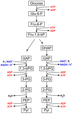 Glicólise é realizado por todos os organismos vivos e consiste em 10 etapas. A reação líquida para o processo global de glicólise é:[7]