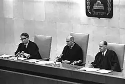 O julgamento de Eichmann no Tribunal da Comarca de Jerusalém teve início em 11 de abril de 1961.[145] A base legal das acusações contra ele era a Lei (da Condenação) dos Colaboradores Nazis de 1950,[146][nota 6] ao abrigo da qual foi indiciado por 15 crimes, incluindo crimes contra a humanidade, crimes contra os judeus e associação em uma organização criminosa.[147][nota 7] O julgamento foi presidido por três juízes: Moshe Landau, Benjamin Halevy e Yitzhak Raveh.[148], sendo procurador principal Gideon Hausner, assistido por Gabriel Bach do Departamento de Justiça e pelo Procurador Distrital de Tel Aviv Yaakov Bar-Or.[149] A equipa de defesa era constituída pelo advogado alemão Robert Servatius, acompanhado do assistente Dieter Wechtenbruch, e pelo próprio Eichmann.[150]