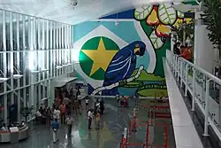 Vista interna do Aeroporto Internacional Marechal Rondon. A pintura, que tem, como tema, o Pantanal, na verdade esconde a parte que está para ser ampliada.