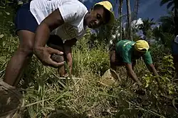 A agricultura familiar, assim considerada a que emprega apenas o núcleo familiar (pai, mãe, filhos e, eventualmente, avós e tios) nas lides da terra,[41] podendo empregar até cinco trabalhadores temporários,[42] é responsável direta pela produção de grande parte dos produtos agrícolas brasileiros. Responde, assim, pela produção de 69,6% da mandioca, 23,1% do feijão e 12,5% do milho.[43]