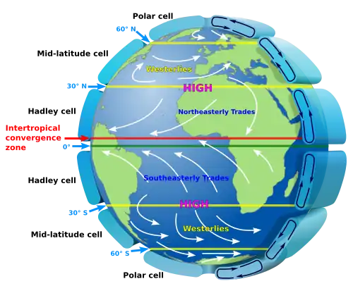 Os ventos regulares que durante o ano sopram regularmente de NE no hemisfério Norte e do SE no do Sul. A partir dos 30º vão diminuindo de intensidade em direção ao Equador até se extinguirem formando ali a zona de calmarias equatoriais.