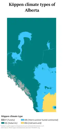 O norte de Alberta é coberto principalmente por floresta boreal e tem um clima subártico. A área agrícola do sul de Alberta tem um clima de estepe semiárido, pois a precipitação anual é menor do que a quantidade de água que evapora ou é usada para as plantas. O canto sudeste de Alberta, parte do Triângulo de Palliser, experimenta um calor maior no verão e chuvas mais reduzidas do que no resto da província e, como resultado, sofre com frequentes problemas de produção agrícola e secas severas ocasionais. O oeste de Alberta é protegido pelas montanhas e usufrui de temperaturas amenas trazidas pelos ventos quentes no inverno. A região central e partes do noroeste de Alberta, na região do Rio Peace, são, em grande parte, um bioma de transição entre a pradaria ao sul e a floresta boreal ao norte.