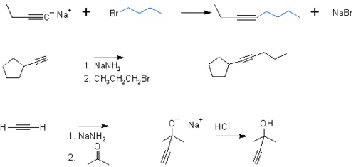 Os carbânions gerados pela desprotonação de alcinos terminais são chamados acetiletos.[5] Atribui-se a maior acidez dos alcinos à maior eletronegatividade do orbital sp, em comparação com os orbitais sp2 e sp3 de alcenos e alcanos, respectivamente. A base conjugada dos alcinos atuam como nucleófilos em reações de substituição nucleofílica e adição à carbonila.