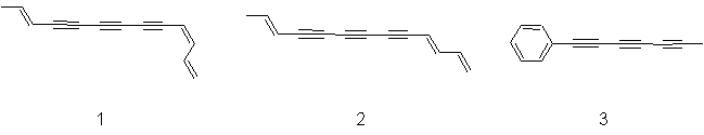 Compostos com ligação tripla carbono-carbono são pouco comuns na natureza.[2] Os compostos (1) e (2) abaixo foram isolados das flores de açafrão (Carthamus tinctorins) e o composto (3) das folhas e flores do picão (Bidens pilosa), demonstrando atividade nematicida.