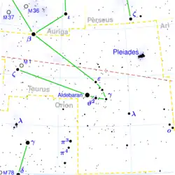 Alpha Tauri (α Tau) conhecida como Aldebarã ou Aldebaran é a estrela mais brilhante da constelação Taurus.[4] É também designada pelos nomes de Cor Tauri; Parilicium; Olho do Touro; Oculus Caelorum, por causa de seu brilho intenso parecendo uma íris e sua posição no rosto de Touro; ou ainda, pelos códigos HR 1457 e HD 29139.