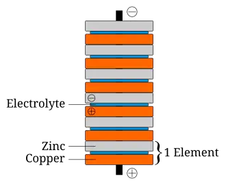 Volta descobriu então que uma força eletromotriz seria gerada quando dois metais heterogêneos eram colocados em contato. Em 1800 Volta idealizou a pilha voltaica, predecessora da bateria elétrica, onde ele dispôs diversos discos metálicos empilhados em série, separados por discos de feltro encharcados de solução condutora.[14] A pilha de discos alternados de cobre e de zinco, separados por discos de papelão úmido foi a primeira bateria elétrica e também a primeira fonte geradora de um fluxo contínuo de energia elétrica.[15]