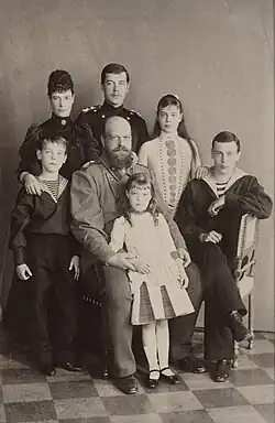| Xenia | ![]() | 6 de abril de 1875 c.g. 25 de março de 1875 | 20 de abril de 1960 | Casada com o grão-duque Alexandre Mikhailovich da Rússia; com descendência. |