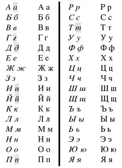 Ao longo do século XIX (oficializado na reforma de 1918), foram perdidas outras letras que subsistiam por motivos etimológicos e não fonéticos: ѳ (soava como ф), ѣ (soava como е), і e ѵ (soavam como и). Em paralelo, foram adicionados a letra э, para diferenciar do е palatalizado, e ё, para diferenciar /jo/ de /je/, levando o russo ao seu alfabeto de 33 letras: А, Б, В, Г, Д, Е, Ё, Ж, З, И, Й, К, Л, М, Н, О, П, Р, С, Т, У, Ф, Х, Ц, Ч, Ш, Щ, Ъ, Ы, Ь, Э, Ю e Я.