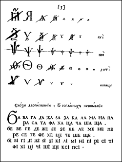 Página de Azbuka, o primeiro livro sobre a língua russa, impresso por Ivan Fyodorov em 1574. A página mostra o alfabeto cirílico.