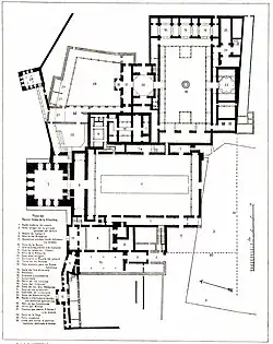 O seu elemento mais ocidental é a alcáçova (cidadela); uma posição fortemente fortificada. O resto do planalto compreende vários palácios, cercados por uma muralha defensiva relativamente fraca, flanqueada por 13 torres, algumas defensivas e outras destinadas a providenciar vistas panorâmicas para os seus habitantes.