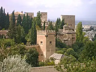 ![]() A Alhambra vista dos jardins da Generalife, ao fundo o bairro de Albaicín | |