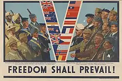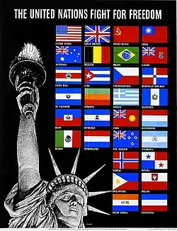 ![]() Um pôster de 1943 mostrando as bandeiras de muitos membros dos Aliados, incluindo os "Três Grandes"