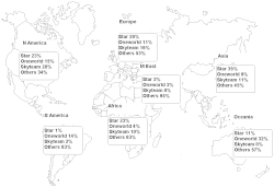 Em 2015, a Star Alliance foi a maior com 23% do tráfego total programado em receita de passageiros-quilômetros (RPKs)/receita de passageiros por milhas (RPMs), seguida pela SkyTeam com 20,4% e Oneworld com 17,8%, deixando 38,8% para os demais.[2] Em 2019, em número de passageiros, a Star Alliance liderava com 762 milhões,[3] seguida pela SkyTeam (630 milhões)[4] e Oneworld (535 milhões).[5]