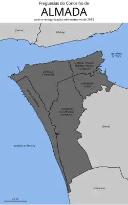 O município de Almada está dividido em cinco freguesias, que anteriormente à reforma administrativa de 2013 eram onze:[5]