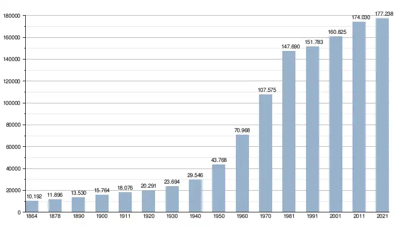 | 1864 | 1878 | 1890 | 1900 | 1911 | 1920 | 1930 | 1940 | 1950 | 1960 | 1970 | 1981 | 1991 | 2001 | 2011 | 2021 |