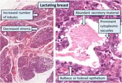 O desenvolvimento dos seios começa na puberdade com o crescimento dos ductos, células de gordura e tecido conjuntivo.[18]:18–21 O tamanho final dos seios é determinado pelo número de células de gordura. O tamanho da mama não está relacionado à capacidade de amamentação da mãe ou ao volume de leite que ela produzirá.[18]:18–21 O processo de produção de leite, denominado lactogénese, ocorre em três estágios. A primeira fase ocorre durante a gravidez, permitindo o desenvolvimento da mama e a produção de colostro, a forma espessa e inicial do leite, de baixo volume, mas rica em nutrientes.[18]:18–21 O nascimento do bebé e da placenta desencadeia o início do segundo estágio da produção de leite, fazendo com que o leite seja suficiente nos próximos dias. A terceira fase da produção de leite ocorre gradualmente ao longo de várias semanas e é caracterizada por um suplemento completo do leite que é regulado localmente (no seio), predominantemente pela procura alimentar e sucção do bebé, que mantém os níveis de prolactina elevados, permitindo a contínua produção de leite.[19] Isso difere do segundo estágio da lactogénese, que é regulado centralmente (no cérebro) por ciclos de retoma hormonal que ocorrem naturalmente após a expulsão da placenta.[18]:18–21[20]