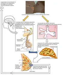 A terceira fase do trabalho de parto descreve o período entre o nascimento do bebê e a expulsão da placenta, que normalmente dura menos de 30 minutos.[26] A libertação da placenta causa uma queda abrupta dos hormónios placentários.[26][18]:18–21[23] Essa queda, especificamente na progesterona, permite que a prolactina funcione eficientemente nos receptores na mama, levando a uma série de alterações nos dias seguintes que permitem que o leite “entre”; essas mudanças são conhecidas coletivamente como Lactogénese II.[18]:18–21[23][27] O colostro continua a ser produzido nos dias seguintes, conforme ocorre a Lactogénese II.[18]:18–21 O leite pode “chegar” até cinco dias após o parto; no entanto, esse processo pode ser atrasado devido a vários fatores, conforme descrito na subseção Processo.[18]:18–21[23] A oxitocina, que sinaliza o músculo liso do útero para que se contraia durante a gravidez, trabalho de parto, nascimento e pós-parto, também está envolvido no processo de amamentação.[26][23] As sucções do bebê na mama favorece a produção do leite, devido a ocorrência do estímulo da glândula cerebral hipófise, que libera a prolactina também conhecido como hormônio lactogênico e a ação do hormônio hipófise posteriormente também produz o hormônio ocitocina que usando a corrente sanguínea chega às células que envolvem os alvéolos provocando a apojadura (descida do leite até as ampolas das aréolas), completando a ação da descida com as sucções do bebê.[28] A oxitocina também contrai a camada muscular lisa de células semelhantes a faixas que circundam os ductos de leite e alvéolos para formar o leite recém-produzido através do sistema de dutos que sai pelo mamilo.[18]:18–21[23] Este processo é conhecido como reflexo de ejeção do leite ou descida.[18]:18–21 Devido à dupla atividade da oxitocina na mama e no útero, as mães que amamentam também podem sentir cólicas uterinas na amamentação, durante os primeiros dias ou semanas.[23]