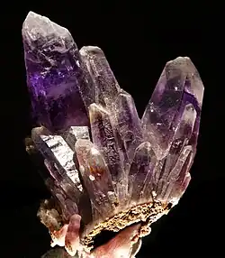 A ametista é a variedade mais apreciada do quartzo. Os seus cristais sempre crescem sobre uma base. Quando têm formato de pirâmides, a cor mais intensa predomina nas pontas dos cristais. Existem algumas variedades de ametista que podem apresentar faixas brancas de quartzo leitoso, assim como apresentar a cor violeta no meio dos cristais. Também ocorrem inclusões de minerais, muitas vezes aciculares. Há uma variedade de rutilo, sagenita, que costuma formar as "Cabeleiras-de Venus" nos quartzos.