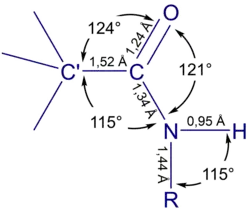 A planaridade da ligação C=O se estende aos grupos ligados ao nitrogênio, conforme a figura ao lado.