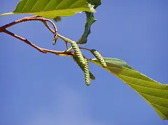 É uma espécie monóica, com flores masculinas e femininas na mesma planta e agrupadas em inflorescências. As flores masculinas formam amentilhos – género de espiga alongada, com uma forma cilíndrica, compridos e de cor púrpura durante o inverno e verde na primavera. As flores femininas são agrupadas em amentilhos ovóides, lenhificados, que fazem lembrar pequenas pinhas, de cor vermelho-púrpura, que se tornam verdes na primavera e castanhas depois de ocorrer a fecundação. A formação das inflorescências inicia-se no outono e a floração é regular, abundante e ocorre entre janeiro e março, antes do surgimento das folhas.