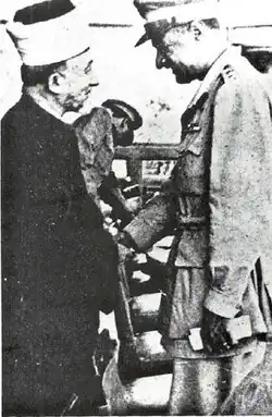 Quando a resistência iraquiana entrou em colapso – dada a sua escassez, a assistência alemã e italiana desempenhou um papel insignificante na guerra [178] – al-Husseini escapou de Bagdá em 30 de maio de 1941 para a Pérsia (junto com Rashid Ali), onde recebeu asilo extraterritorial primeiro do Japão e depois da Itália. Em 8 de outubro, após a ocupação da Pérsia pelos Aliados e depois que o novo governo persa do Xá Mohammad Reza Pahlavi cortou relações diplomáticas com as potências do Eixo, al-Husseini foi colocado sob proteção italiana. [179] [180] Em uma operação organizada pela Inteligência Militar Italiana (Servizio Informazioni Militari, ou SIM). [181] Al-Husseini não foi bem-vindo na Turquia, nem recebeu permissão ou visto para entrar; no entanto, ele viajou pela Turquia com a ajuda de diplomatas italianos e japoneses para chegar à Bulgária e, eventualmente, à Itália. [182]