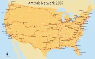 A Amtrak opera uma rede ferroviária nacional que serve a mais de 500 destinos, em 46 estados da federação, através de 33 800 quilômetros de trilhos, com mais de 20 000 funcionários.[1] Três rotas atendem o Canadá, servindo metrópoles como Montreal,[2] Toronto[3] e Vancouver,[4] além de destinos intermediários.