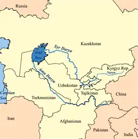 Mapa da Ásia Central com o Mar de Aral e os rios Amu Dária e Sir Dária. O mapa ilustra as margens do Mar de Aral como eram na década de 1960.