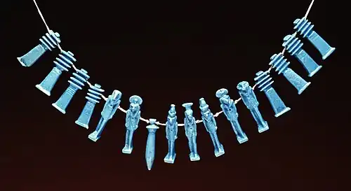 O material mais comum para tais amuletos era um tipo de cerâmica conhecida como faiança egípcia ou tjehenet, mas os amuletos também eram feitos de pedra, metal, osso, madeira e ouro.[4] :66[7] Os filactérios contendo textos eram outra forma comum de amuleto.[8]