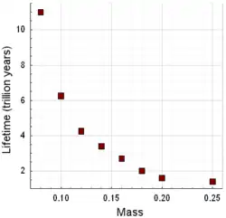 Como as anãs vermelhas de baixa massa são totalmente convectivas, o hélio não se acumula no núcleo e, em comparação com estrelas maiores como o Sol, podem queimar uma proporção maior de seu hidrogênio antes de deixar a sequência principal. Como resultado, as anãs vermelhas estimaram uma expectativa de vida muito mais longa do que a idade atual do universo, e estrelas com menos de 0.8 M☉ não tiveram tempo de deixar a sequência principal. Quanto menor for a massa de uma anã vermelha, maior será sua vida útil. Acredita-se que a expectativa de vida dessas estrelas excede a expectativa de vida de 10 bilhões de anos de nosso Sol pela terceira ou quarta potência da razão entre a massa solar e suas massas; assim, uma anã vermelha de 0.1 M☉ pode continuar queimando por 10 trilhões de anos.[15][19] Conforme a proporção de hidrogênio em uma anã vermelha é consumida, a taxa de fusão diminui e o núcleo começa a se contrair. A energia gravitacional liberada por essa redução de tamanho é convertida em calor, que é transportado por toda a estrela por convecção.[20]