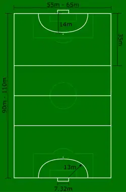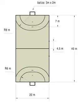 O campo é um retângulo de 40m x 20m, tendo em cada uma das extremidades do comprimento, uma área de 6 metros de comprimento reservada para os guarda-redes.