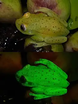 Agora, sabe-se que o fenômeno pode ser observado em diversos anfíbios, incluindo anuros, caudados e cecílias.[57][61] Notou-se que anfíbios fluorescem de verde a amarelo em resposta à luz azul (440-460 nm) e à luz ultravioleta (360-380 nm), mas a luz biofluorescente emitida sob excitação azul é mais intensa.[57]