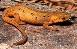 Muitos casos de mimetismo são conhecidos entre os anfíbios. A salamandra Notophthalmus viridescens tem um estágio juvenil e terrestre chamado eft vermelho, que tem a toxinas na pele, não sendo predada por aves. Outras salamandras com estágio adulto terrestre com a pele vermelha, como Pseudotriton ruber, que ocorrem nas mesmas localidades de N. viridescens são beneficiadas sendo menos atacadas por aves.[24]