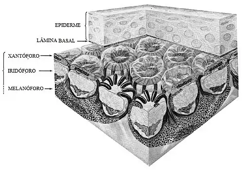 No geral, a mudança de cor fisiológica nos anfíbios é mediada por xantóforos, iridóforos e melanóforos, que formam uma estrutura denominada unidade de cromatóforo dérmico (UCD). Morfologicamente, verifica-se os cromatóforos organizados em camadas. Os xantóforos são os elementos mais externos, sendo encontrados logo abaixo da lâmina basal. Sob eles estão os iridóforos e, por fim, abaixo deles encontram-se os melanóforos. Dos melanóforos são estendidos processos ao redor dos iridóforos com estruturas semelhantes a dedos que ocupam o espaço entre os xantóforos e iridóforos.[32]