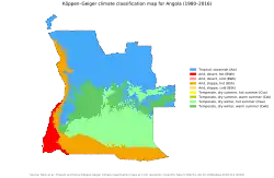 Angola, apesar de se localizar nos trópicos, não é totalmente caracterizada pelo clima dessa região,[38][39] devido à confluência de três factores: a Corrente de Benguela, fria, ao longo da parte sul da costa; o relevo no interior; e a influência do Deserto do Namibe, a sudoeste.[40]