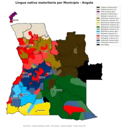| Língua nacional | Quicongo, Chócue, Umbundo, Quimbundo, Ganguela e Cuanhama têm status de línguas nacionais) [1][2] |