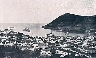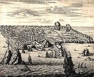 ![]() A cidade de Angra do Heroísmo (ao fundo, as muralhas da Fortaleza de São João Baptista e o Monte Brasil).