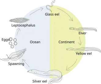 Dois grupos de enguias derivam da espécie ancestral, a Anguilla ancestralis: as dezassete espécies modernas da bacia Indo-Pacífica e duas do Atlântico. Todas a enguias mantiveram o mesmo ciclo de vida: nascem em águas quentes marinhas, vivem e morrem em água doce. A Anguilla atlantidis surgiu no Mar dos Sargaços, no Oceano Atlântico primordial, que era menor do que agora. Estas enguias atingiam à deriva as costas Norte-Americana e Europeia, do que resultaram a enguia norte-americana (Anguilla rostrata) e a enguia europeia (Anguilla anguilla), que diferem apenas quanto ao número de vértebras (as europeias possuem cento e quinze vértebras e as norte-americanas cento e sete). A expansão do Oceano Atlântico aumentou a distância entre a costa Europeia e o Mar dos Sargaços, tendo a enguia europeia que regressar ao Mar dos Sargaços para procriar.[10]