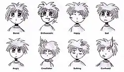 Os artistas de anime e mangá costumam usar um cânone comum de ilustrações icônicas de expressões faciais para denotar humor e pensamentos específicos.[33] Essas técnicas costumam ter formas diferentes das contrapartes da animação ocidental e incluem uma iconografia fixa usada como atalho para certas emoções e humores.[34] Por exemplo, um personagem masculino pode desenvolver um sangramento nasal quando despertado. Uma variedade de símbolos visuais é empregada, incluindo gotas de suor para descrever nervosismo, rubor visível por vergonha ou olhos brilhantes por um brilho intenso.[29]