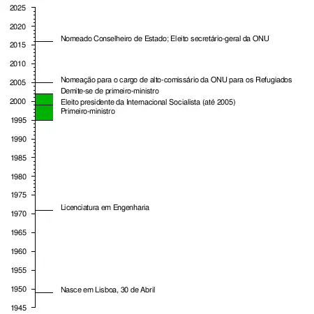 Guterres foi Primeiro-Ministro de Portugal entre 1995 e 2002 e Secretário-Geral do Partido Socialista entre 1992 e 2002. Foi Presidente da Internacional Socialista entre 1999 e 2005.