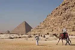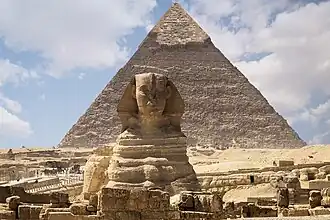 Esfinge com a pirâmide de Quéfren na Necrópole de Gizé (ou Guiza), o complexo de monumentos mais emblemático do Antigo Egito