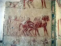 Por volta de 1 785 a.C., com o poder dos faraós do Império Médio enfraquecido, os imigrantes asiáticos residentes na cidade de Ávaris assumiram o controle da região e forçaram o governo central a se retirar para Tebas, onde o faraó era tratado como um vassalo e era obrigado a pagar tributo.[125] Os hicsos (Heka-khasut, governantes estrangeiros) imitaram o modelo de governo egípcio e se apresentaram como faraós, integrando elementos egípcios na sua cultura da Idade do Bronze Médio.[126] Introduziram também elementos novos como o cavalo, os carros de guerra, novos métodos de fiação e tecelagem e novos instrumentos musicais.[123]