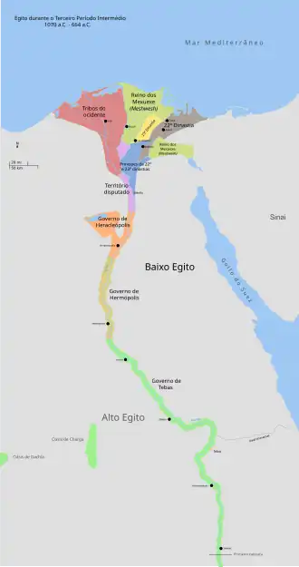 Na mesma época, os líbios tinham se instalado no Delta Ocidental, e os líderes destes colonos começaram a ganhar autonomia. Os príncipes líbios assumiram o controle do delta no reinado de Sisaque I em 945 a.C., fundando a dinastia chamada Líbia ou Bubastilas, que governaria por cerca de 200 anos. Sisaque também ganhou o controle do sul do Egito, ao colocar os seus familiares em importantes cargos sacerdotais. Invadiu a Palestina durante o reinado do rei Roboão e restaurou o comércio com Biblos, aumentando a prosperidade da dinastia.[143]