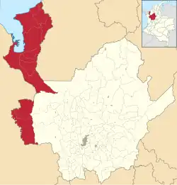 ![]() Apartadó • Arboletes • Carepa • Chigorodó • Murindó • Mutatá • Necoclí • San Juan de Urabá • San Pedro de Urabá • Turbo • Vigía del Fuerte |