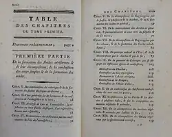 Índice dos volumes 1 de "Traité élémentaire de Chimie" (1789)