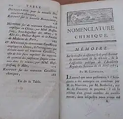 Lavoisier, junto com Louis-Bernard Guyton de Morveau, Claude-Louis Berthollet e Antoine François de Fourcroy, submeteu um novo programa para as reformas da nomenclatura química para a academia em 1787, pois praticamente não havia sistema racional de nomenclatura química na época. Este trabalho, intitulado Méthode de nomenclature chimique (Método de Nomenclatura Química, 1787), introduziu um novo sistema que estava inextricavelmente ligado à nova teoria do oxigênio da química de Lavoisier.[40]