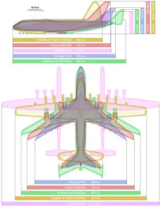 - ↑ O hidroavião Hughes H-4 Hercules, também conhecido como "Spruce Goose", tinha uma maior envergadura e altura total, mas era mais leve (com 113 toneladas vazio) e 20% mais curto devido aos materiais usados em sua construção. O H-4 voou apenas uma vez e por menos de um minuto, com o An-225 se tornando o maior avião do mundo a voar várias vezes.[24][35]