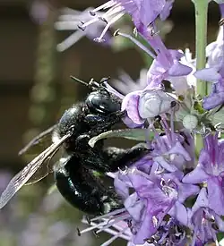 | Xylocopa micans (uma Xylocopini), com uma flor do gênero Vitex | |