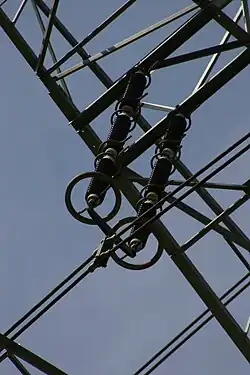 Detalhe de uma coluna de isoladores em uma torre. Os anéis próximos aos cabos e nas ferragens dos isoladores são usados para uniformizar o campo eléctrico, reduzindo o efeito corona.